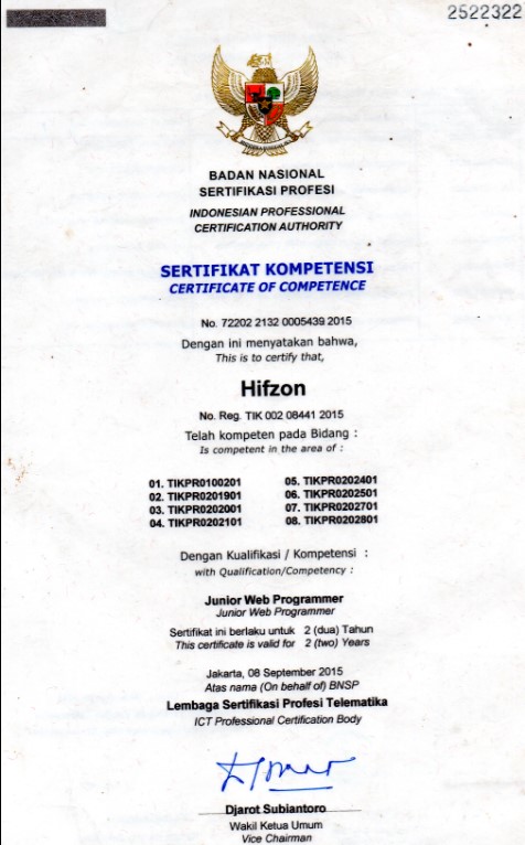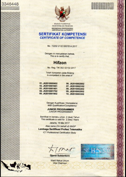 | Sertifikasi Junior Programmer | BNSP | 2015 | |