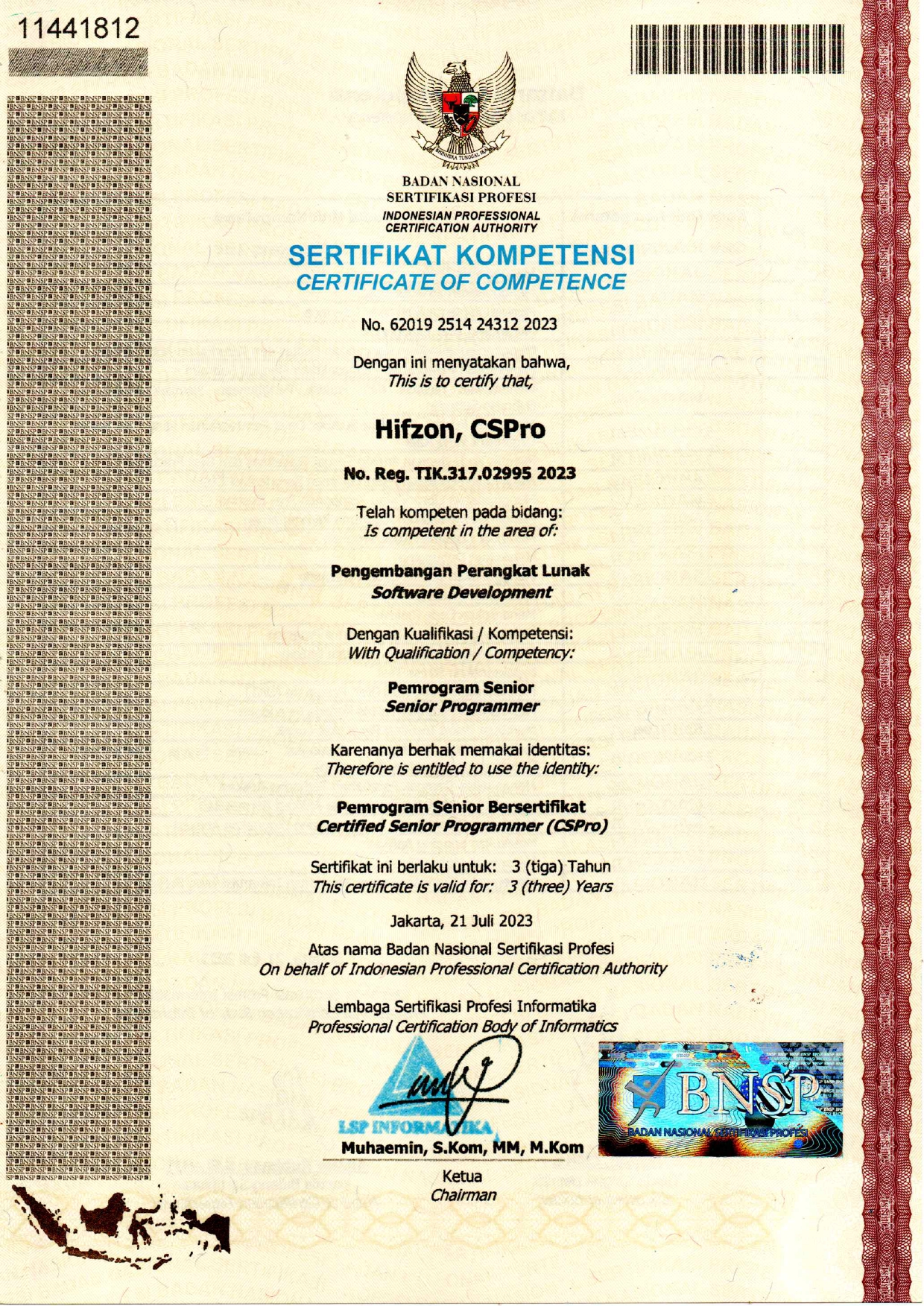 | Sertifikasi Senior Programmer | BNSP | 2023 | |